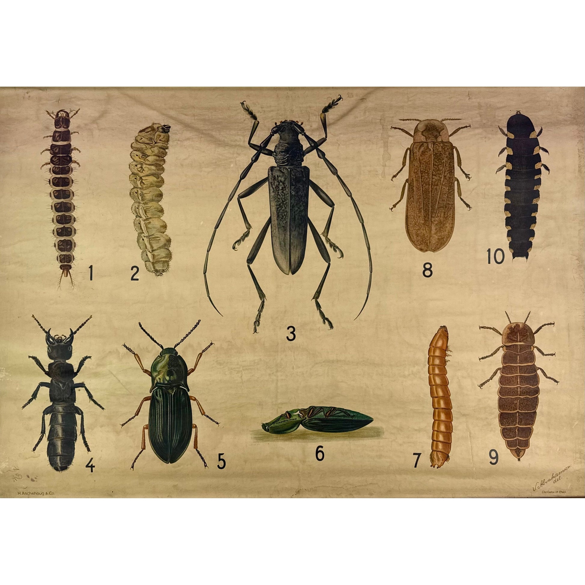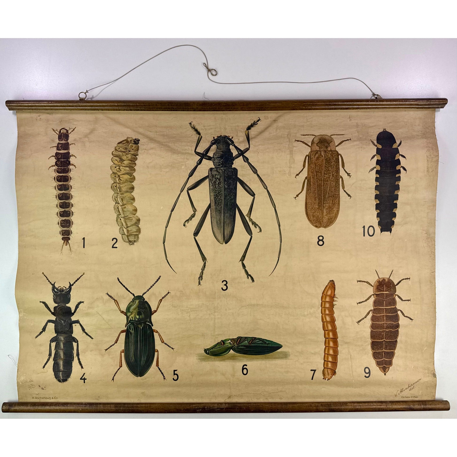 Original early 20th century Canadian educational wall chart depicting beetles and their developmental stages. Issued for classroom use and published by H. Aschenoug & Co., illustrated by J. Abrahams. Mounted on original wooden dowels.