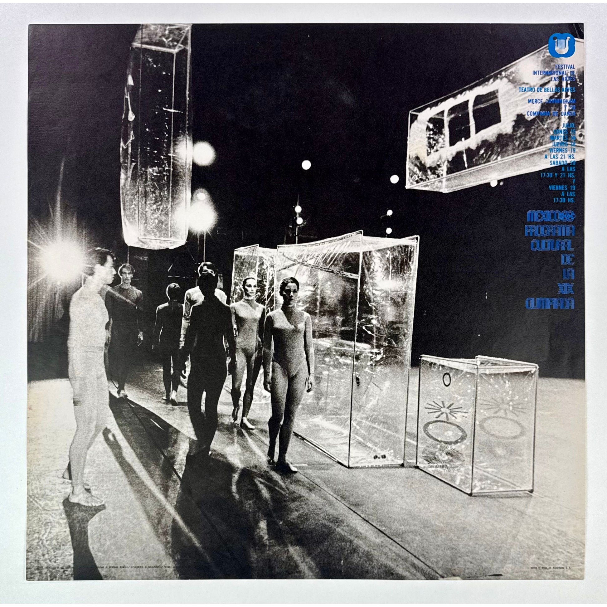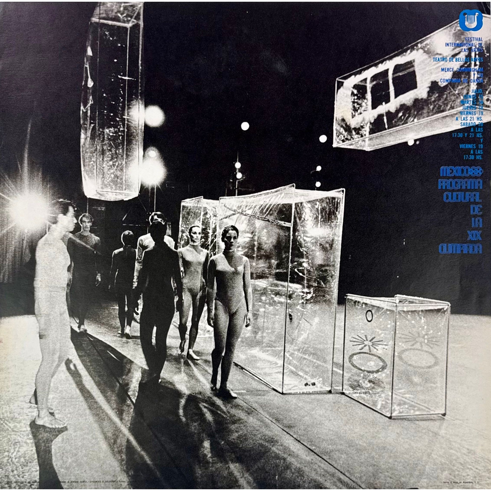 Official cultural poster produced for the Festival Internacional de las Artes as part of the Programa Cultural de la XIX Olimpiada, Mexico City, 1968. Black-and-white photographic composition featuring a contemporary dance scene with stage elements.