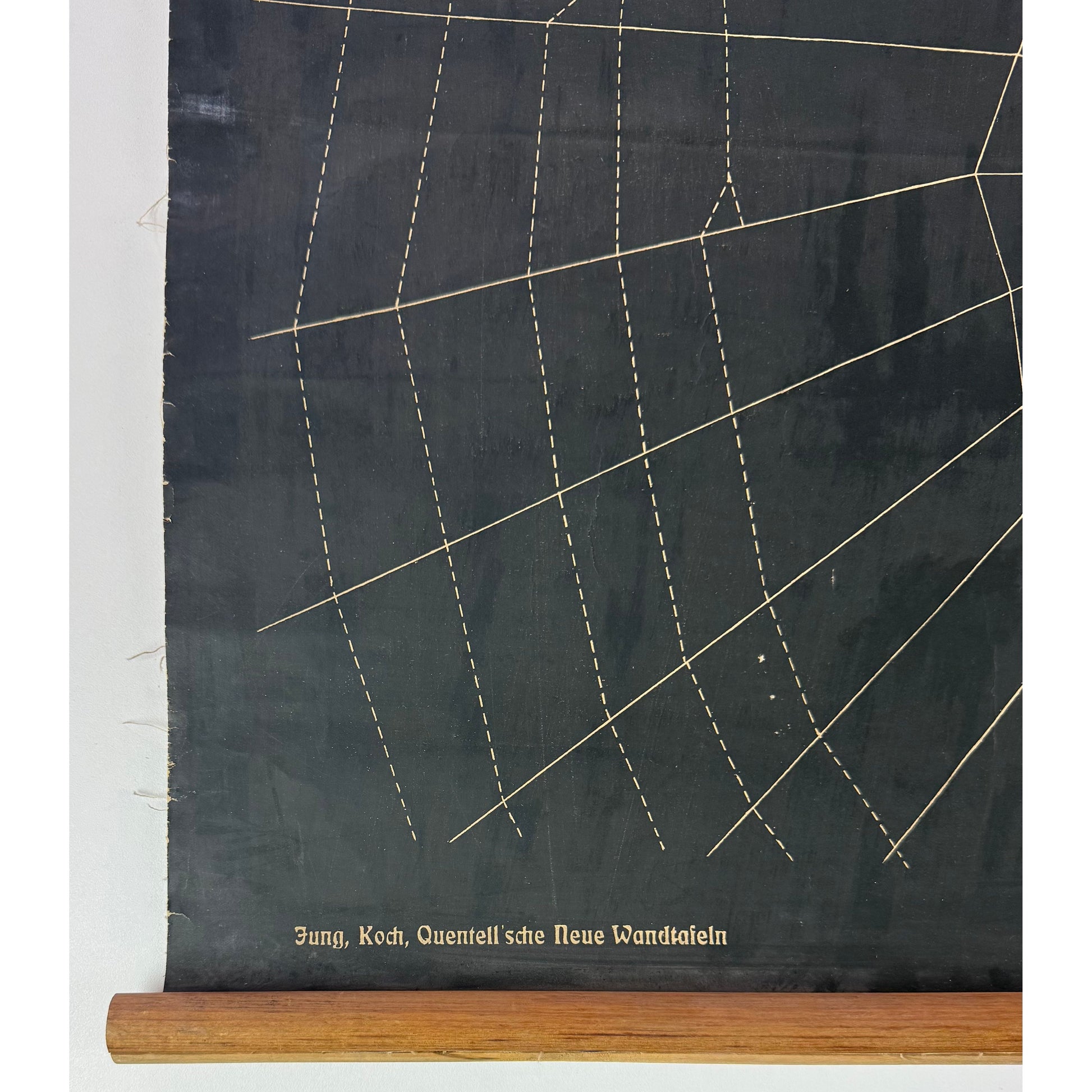 Original German zoological school chart depicting a spider and its web, with detailed anatomical studies of the arachnid including body structure, legs, mouthparts, and silk-related elements. From the Jung, Koch, Quentell’sche Neue Wandtafeln series, published by Verlag Frommann & Morian, Darmstadt. Made in Germany